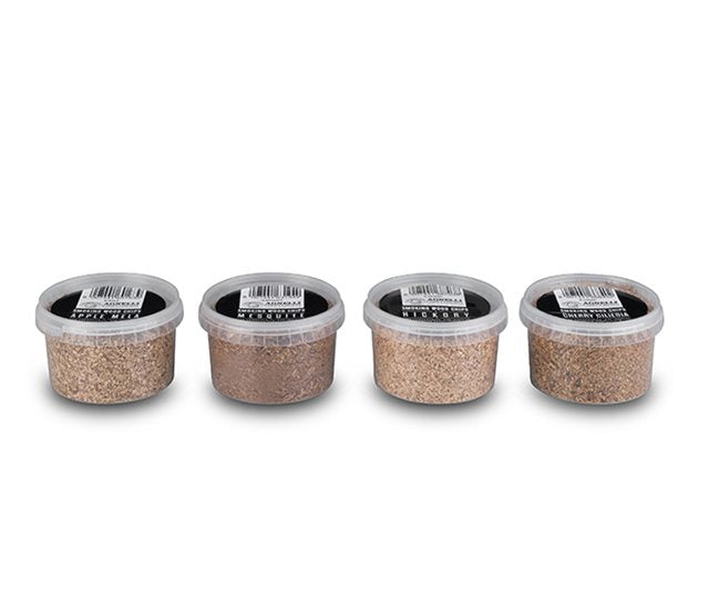 Gamma completa di trucioli in legno per Smoking Gun, Smoke infuser o Mini Affumicatori. Selezione Premium di 4 essenze utilizzate nella tecnica di affumicatura. Confezione in barattolo richiudibile per mantenere al meglio l'aroma.